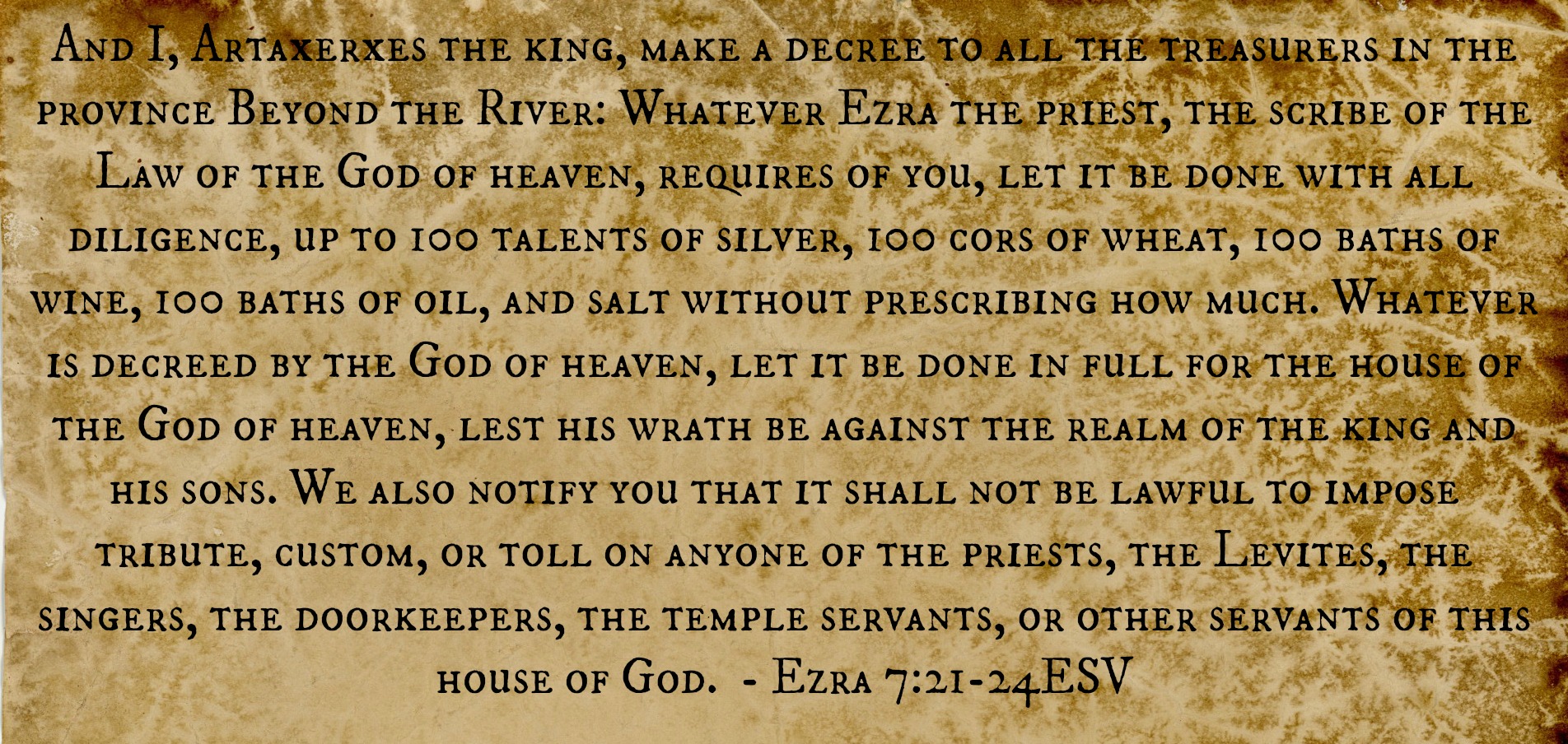 Just as Darius, this king of Persia commands the neighboring peoples to financially aid and support the work in Jerusalem. It is also note-worthy that the house of God and His workers was to be a tax-free institution.